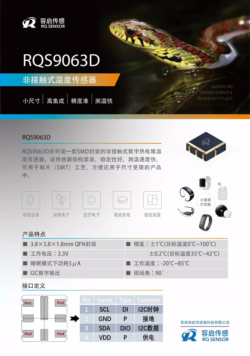 RQS9063D温度传感器可应用于可穿戴设备(智能手表、智能手环、智能耳机)、消费电子、医疗电子、智能家电、智能家居系统等,针对人体温度范围,可实现高精度温度测量。